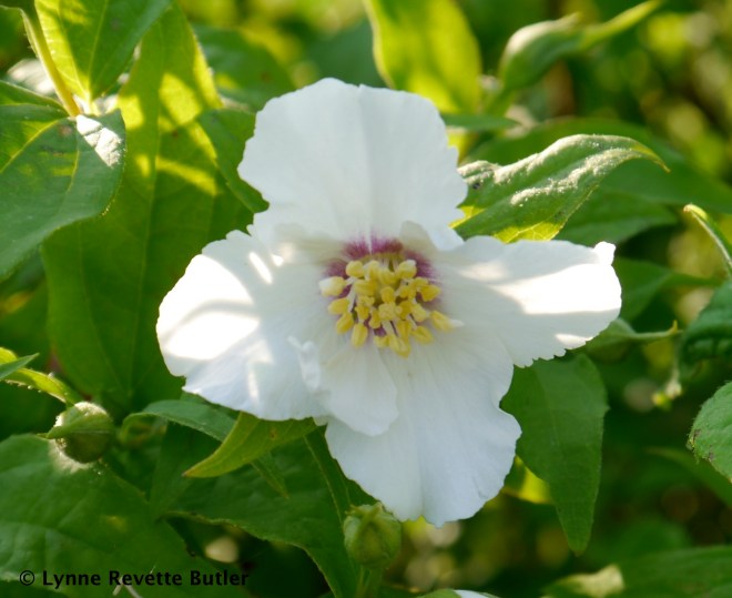 Philadelphus is a deciduous shrub; it’s common name is “mock orange” because the native form’s flowers look similar to orange blossom and the scent has strong citrus notes. As a former Philadelphian I expect you know philadelphia is a Greek word meaning “brotherly love.” Allegedly, Linnaeus named the shrub after King Ptolemy II Philadelphus, one of Cleopatra’s sons. I think it’s native to N. America.